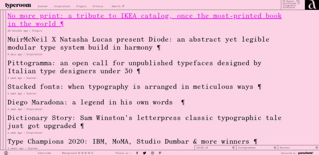 Font tasarımı üzerine hazırlanan çalışmaları sunan bu blog ise tasarıma farklı bir açıdan bakarak okuyuculara ve tasarımcılara yazı tipi ile yaratıcılıklarının sınırlarını ne kadar zorlayabileceklerine dair bir kaynak niteliğinde. Bir yandan çalışmaları inceleme imkanı sunan blog bir yandan da bilgilendirici yazılarla okuyuculara keyifli ve öğretici vakit geçirme imkanı sağlıyor.